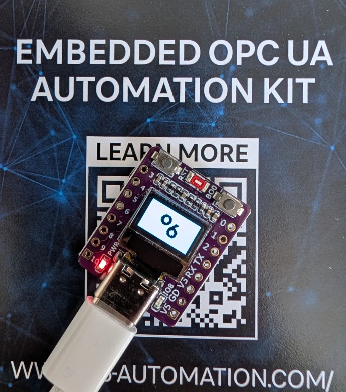 The Embedded OPC UA Automation Kit Documentation turns a ESP32-C3 Microcontroller into a fully featured OPC UA server. Out of the box, the kit provides an OPC UA server on port 4840 with full Namespace Zero and the OPC UA Device Integration (DI) and Encryption.